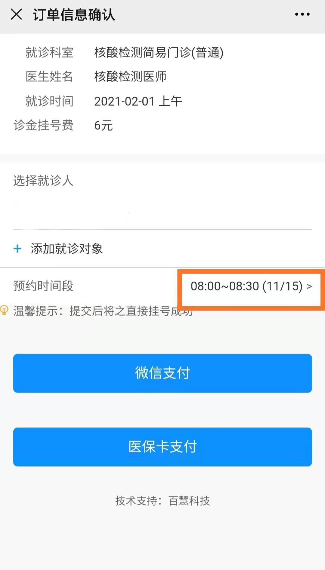 第五步:添加就诊人,选择时间段,完成支付即可预约成功。(1月29日,广东省卫健委下发通知,明确全省不再收取新冠病毒核酸检测挂号费)