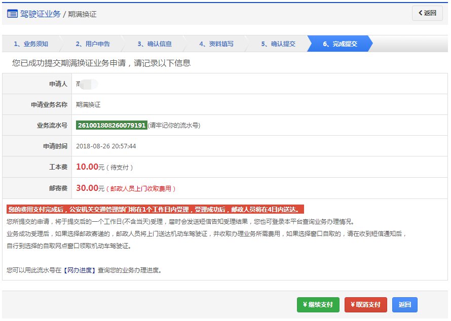 步骤5:【确认提交】返回该步骤显示用户的驾驶证信息、领取详情以及需要缴纳费用信息,如果平台已开通在线支付功能,显示在线支付详情。