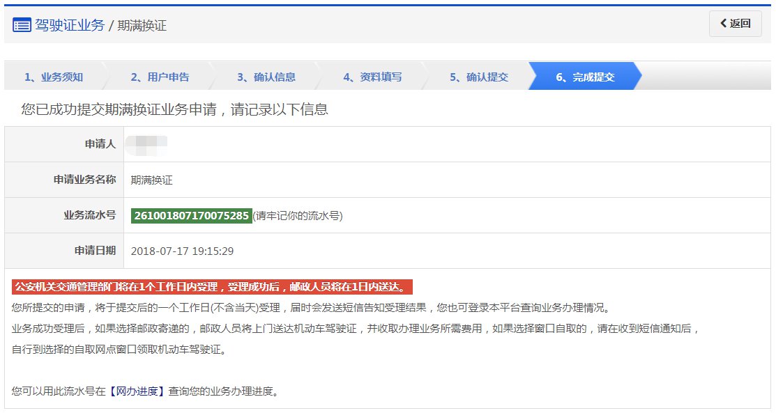 步骤6:【完成提交】返回该步骤提交成功后,系统生成业务流水号。该步骤提交成功后,系统将于提交后的一个工作日(不含当天)受理(选择在线支付的业务费用支付完成后受理),届时会发送短信告知受理结果。用户可以根据该业务流水号在网办进度中查询业务办理进度。