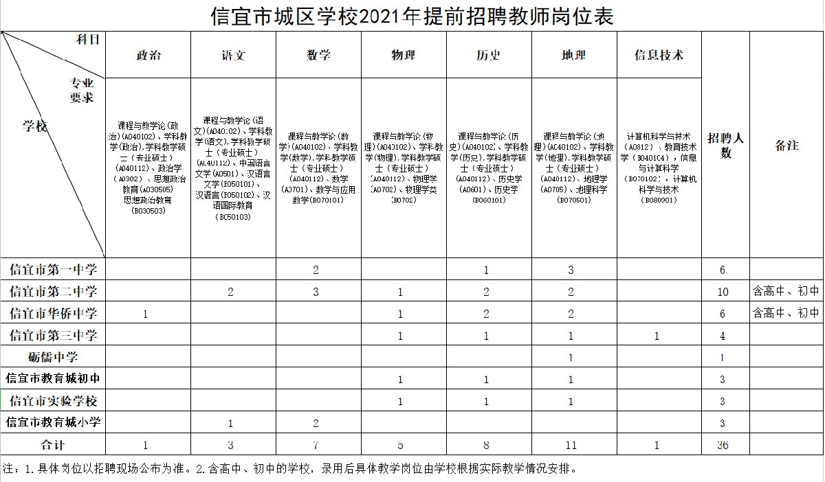 为满足信宜市中小学校对高层次人才的需求,优化教师队伍结构,提高教师队伍素质,中共信宜市委机构编制委员会办公室、信宜市人力资源和社会保障局和信宜市教育局决定提前招聘城区学校教师36人。现公告如下: