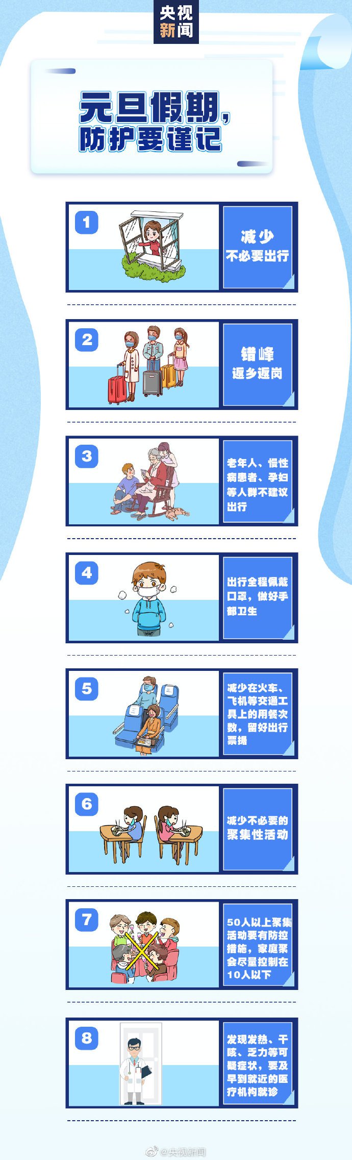 随着元旦假期的临近,各地的人员流动将迎来高峰期。但进入12月以来,内蒙古、天津、四川、黑龙江、北京、辽宁等多地出现的本土确诊病例,让很多人不禁担忧:即将到来的假期,还能正常出行吗?以下是元旦疫情防控要点一览。大家尽量减少不必要的聚集,建议近期不要前往疫情中高风险地区。近期,全国各地城市开始接种新冠疫苗了,故同时附上新冠疫苗接种对象及注意事项。