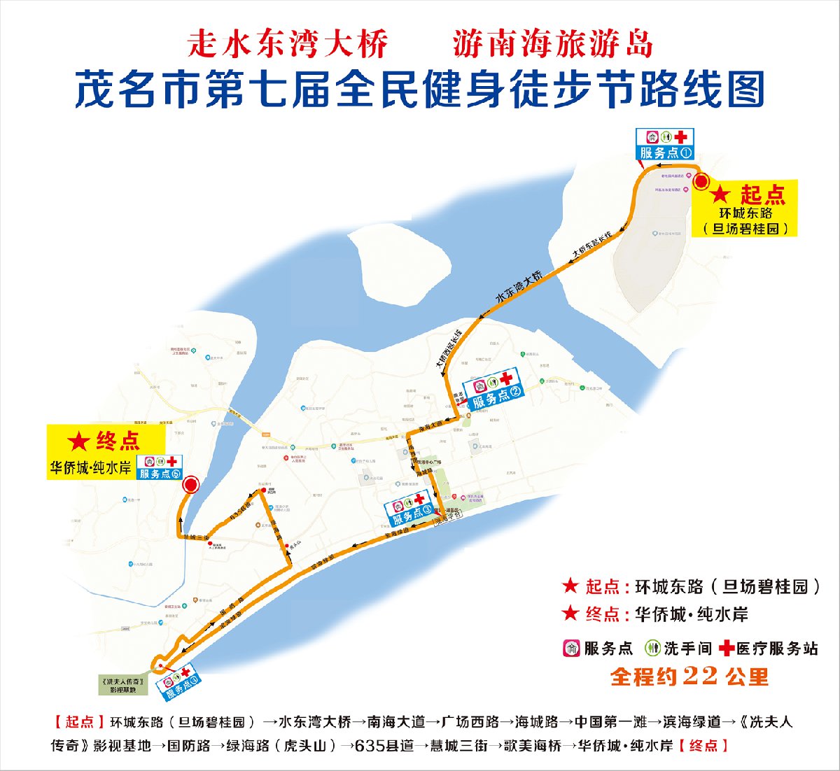 徒步路线:【起点】环城东路(旦场碧桂园)→水东湾大桥→南海大道→广场西路→海城路→中国第一滩→滨海绿道→《冼夫人传奇》影视基地→国防路→绿海路(虎头山)→635县道→慧城三街→歌美海桥→华侨城·纯水岸【终点】
