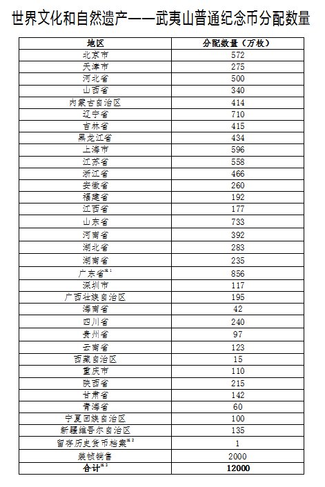 世界文化和自然遗产——武夷山普通纪念币面额为5元,式样为圆角正方形,外接圆直径为30毫米,材质为黄铜合金,发行数量为1.2亿枚,其中,预约兑换数量1亿枚(含留存历史货币档案1万枚),装帧销售数量0.2亿枚。世界文化和自然遗产——武夷山普通纪念币在全国各地区分配数量如下:
