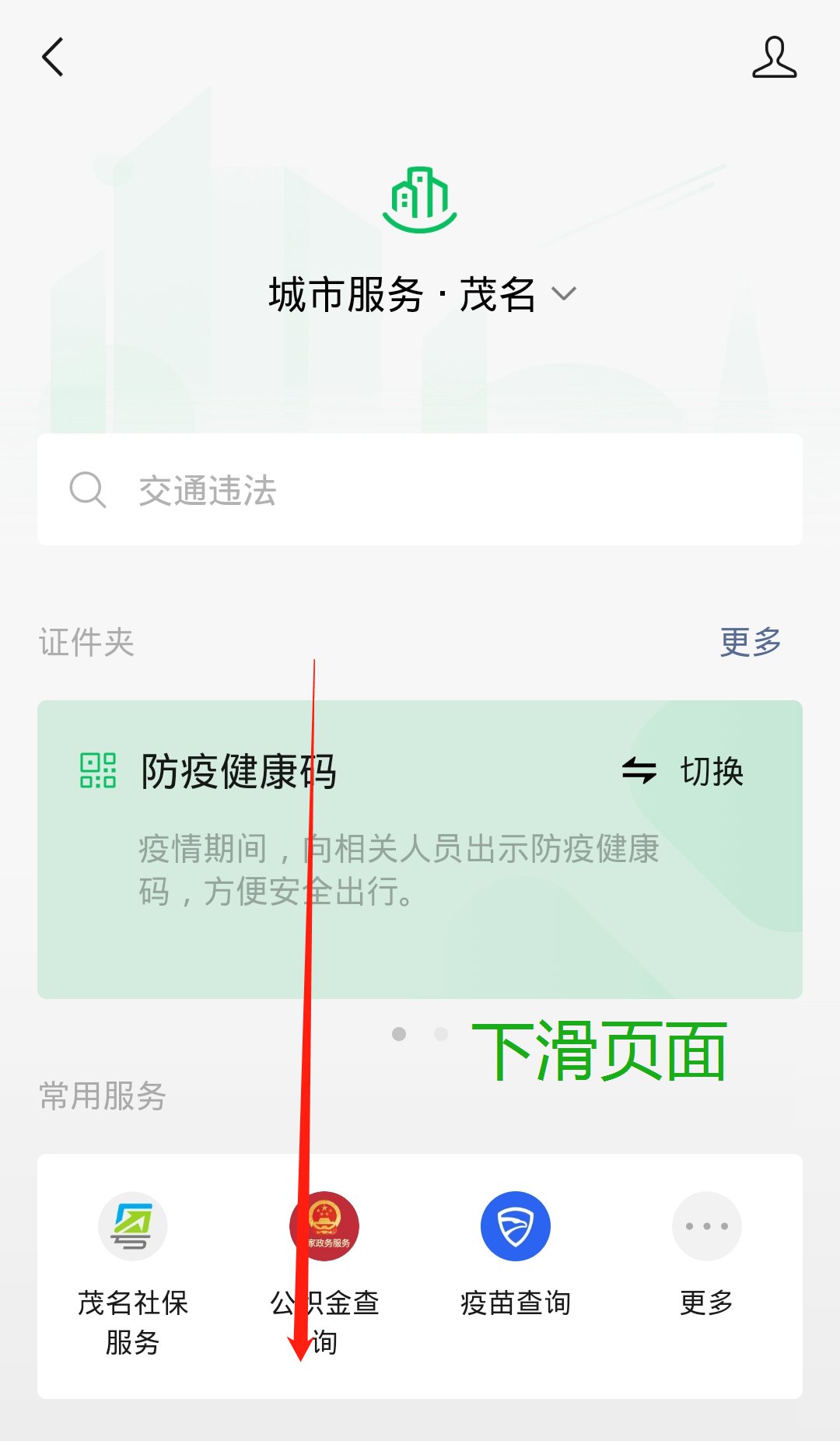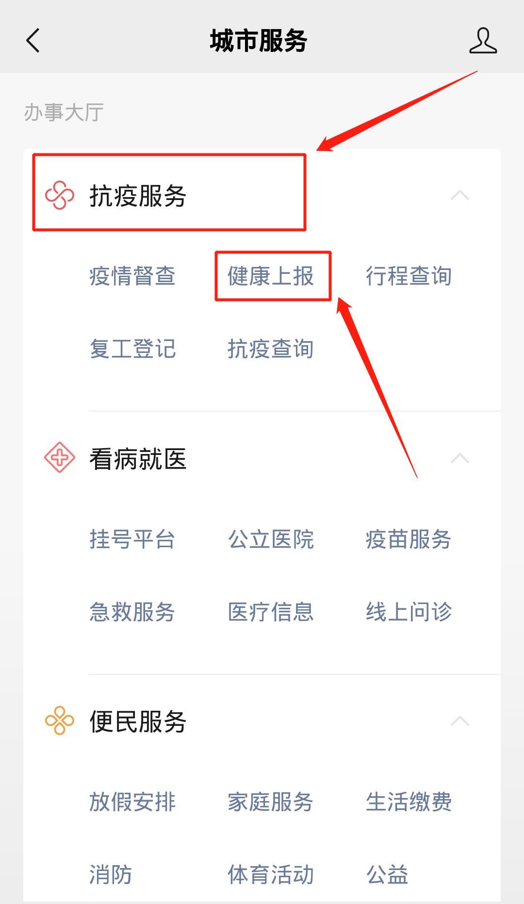 第三步:进入【城市服务】页面以后,下滑找到【抗疫服务】中的【健康上报】。
