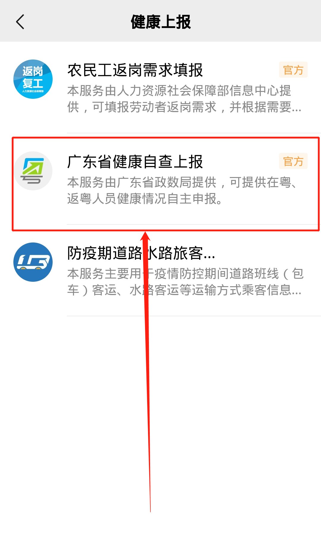 第四步:选择【广东省健康自查上报】,跳转页面后,登录个人信息,并且如实填写个人‘近期居住地址’‘详细居住地址’等内容。