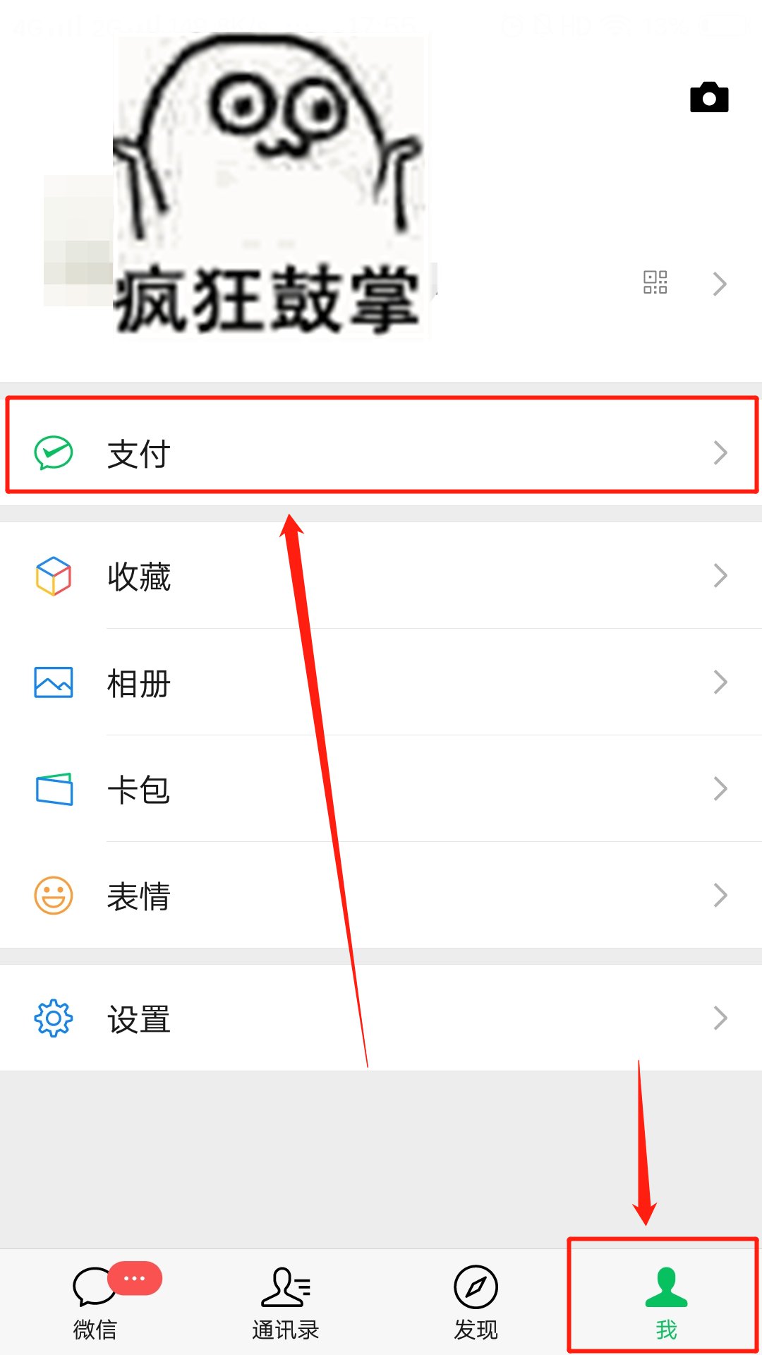 第一步: 打开微信,选择右下方菜单栏的【我】这一项,进入【支付】页面。