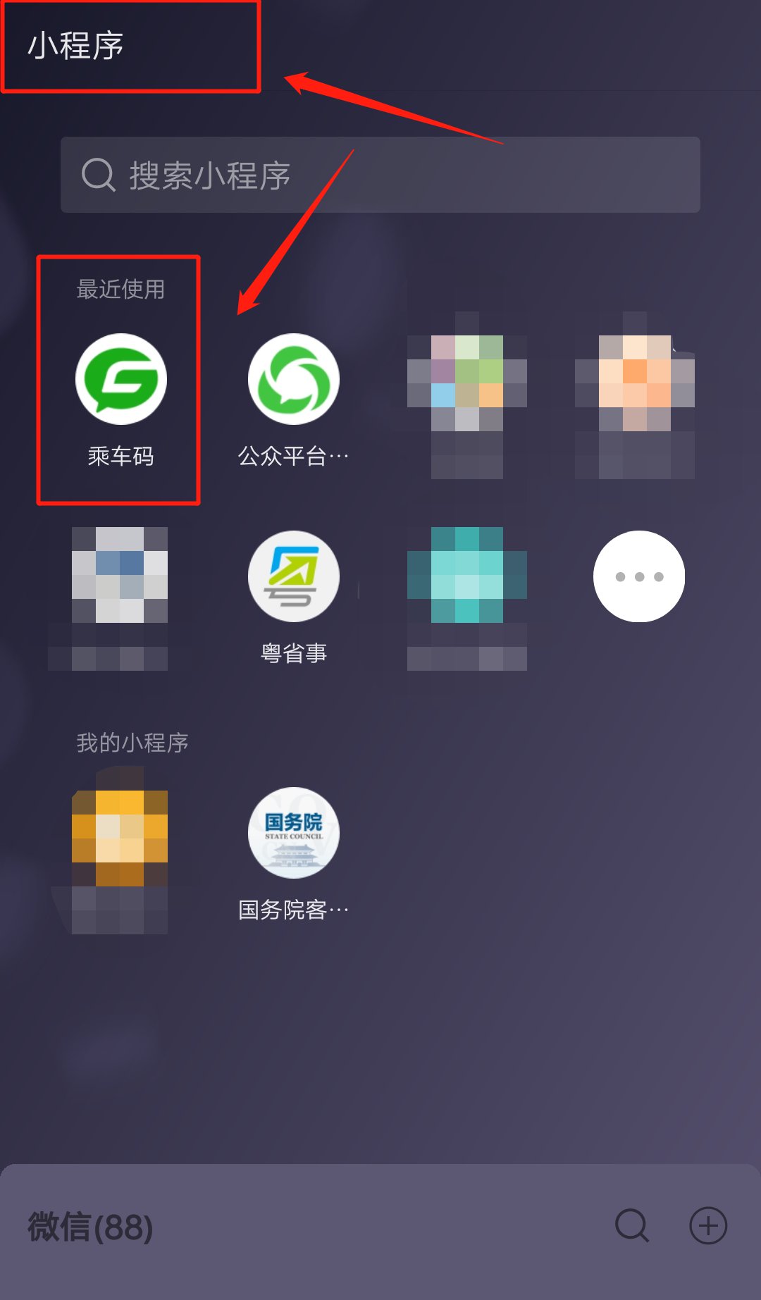 第七步:只要每次乘车的时候,往上拉即可在小程序栏里找到,或者自己搜索【乘车码】小程序即可。