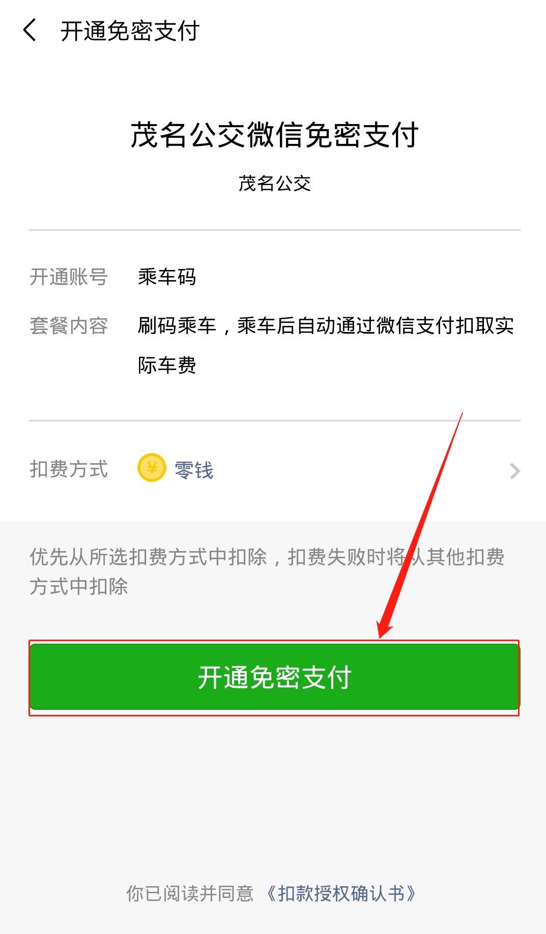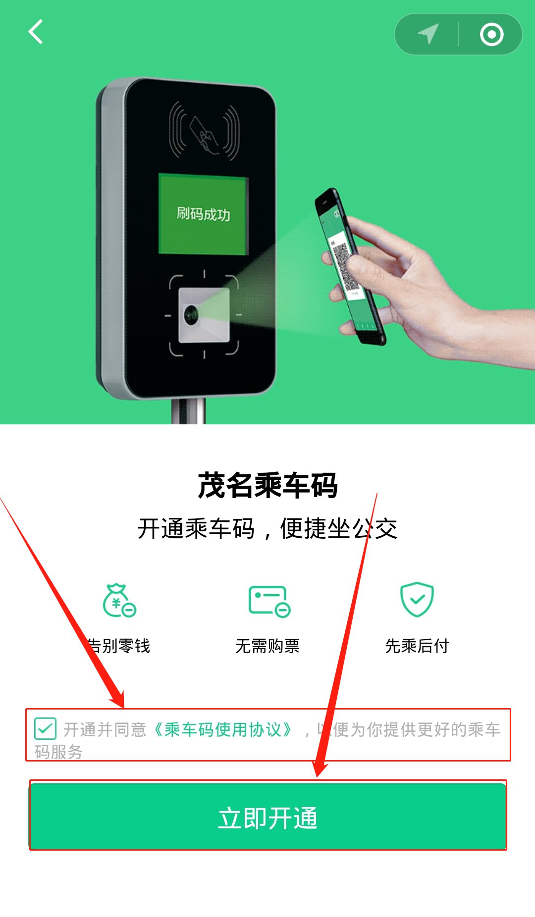 第三步:勾选《乘车码使用协议》,再点击下方立即开通。