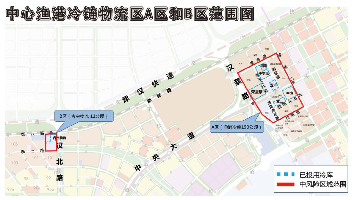 中风险区:天津滨海新区(2个):中心渔港冷链物流A、B区、汉沽街