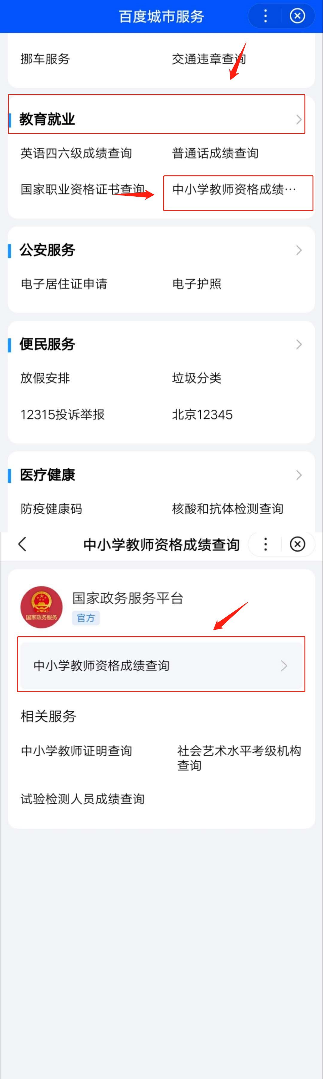 第二步:在教育就业中,找到【中小学教师资格成绩查询】。