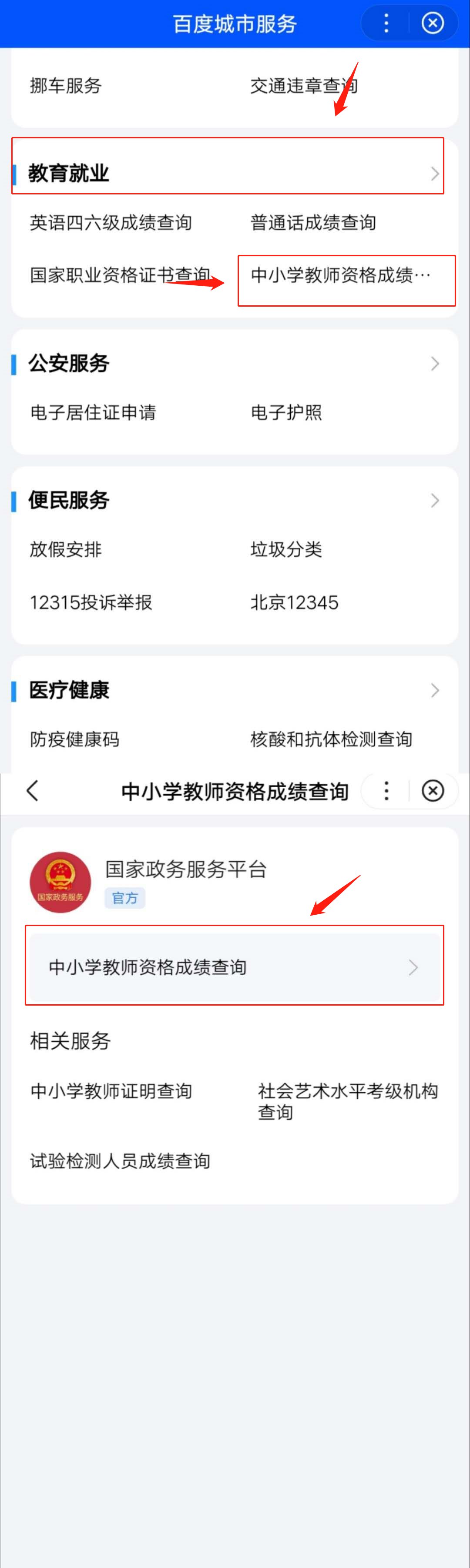 第一步:打开百度APP,并搜索【城市服务】小程序,打开并找到【教育就业】,并选择『中小学教师资格证明查询』。