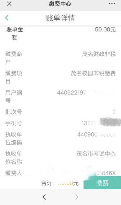 考生务必核查“用户编号”(一般为身份证号码)和缴费人信息,无误后点击“缴费”按钮进行缴费。