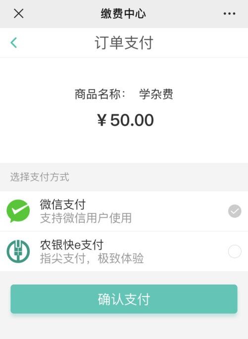 进入到“订单支付”,选择支付方式“微信支付”或“农行快e支付”,进行缴费。