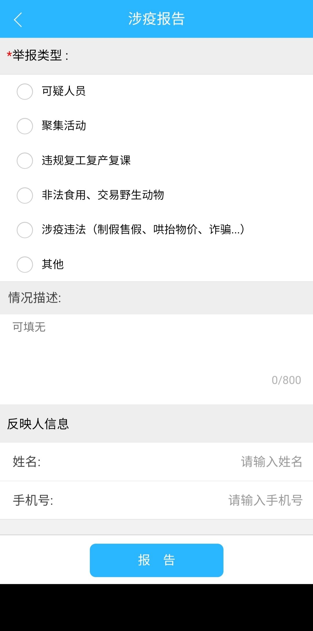 三、选择相应举报的类型,可添加相应描述,再填写个人信息,点击“报告”后,即为成功上报信息。有关部门会进行信息核实并处理。