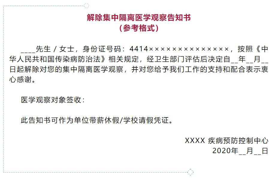 茂名复工返乡的解除集中隔离医学观察告知书格式