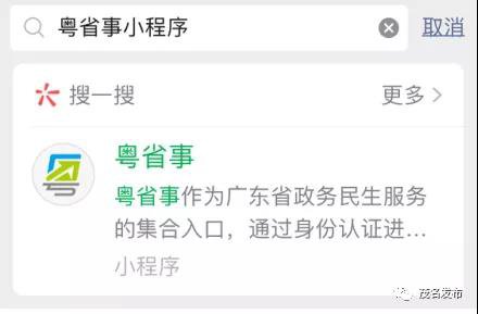 或在微信搜索“粤省事”小程序,点击搜索结果即可进入小程序。