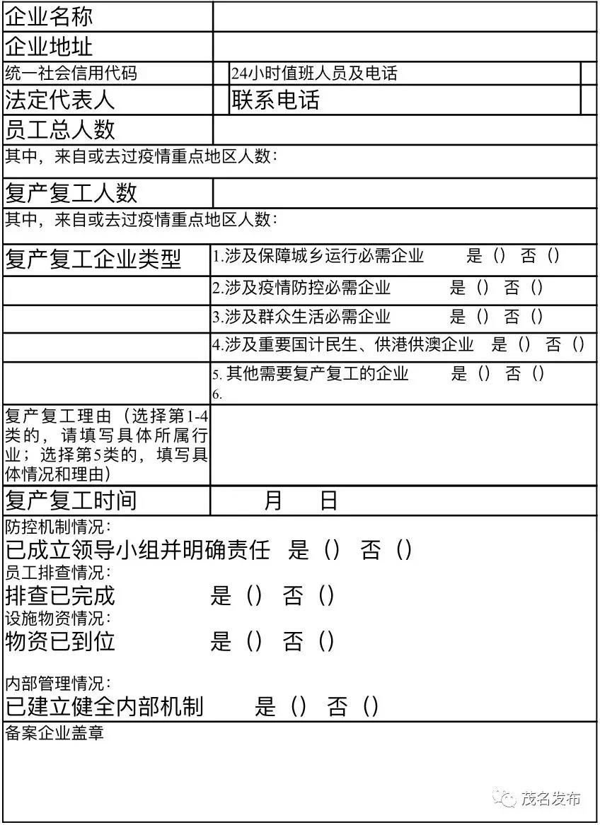 茂名企业复产复工备案表样式 企业复产复工备案表范本