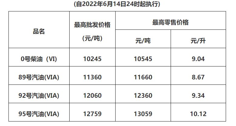 根据国家成品油价格形成机制,结合近一段时期国际市场油价变化情况,国家发展改革委决定自2022年6月14日24时起上调国内成品油价格,即在现行价格的基础上,我省汽、柴油价格每吨分别提高390元和375元。调整后,我省成品油最高销售价格见下表。