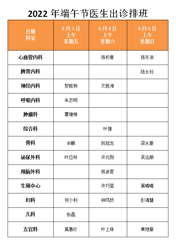 三、2022年端午节放假时间为6月3日-5日,共3天。阳江市妇幼保健院门诊出诊安排如下: