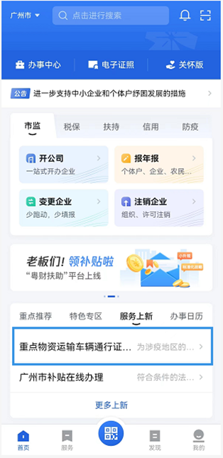 在粤商通APP主界面中查看服务上新,查找到重点物资运输车辆通行证申请(见下图),或选择“服务——按业务分类——选择其他——选择更多”。