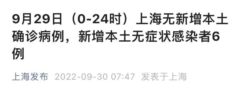 上海市卫健委9月30日通报:2022年9月29日0—24时,无新增本土确诊病例,新增本土无症状感染者6例,均在隔离管控中发现。浦东闵行4个区域划为疫情中风险区。
