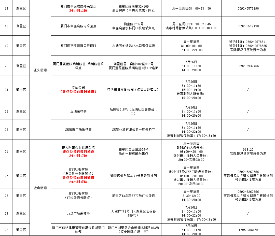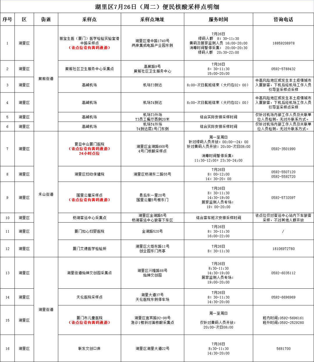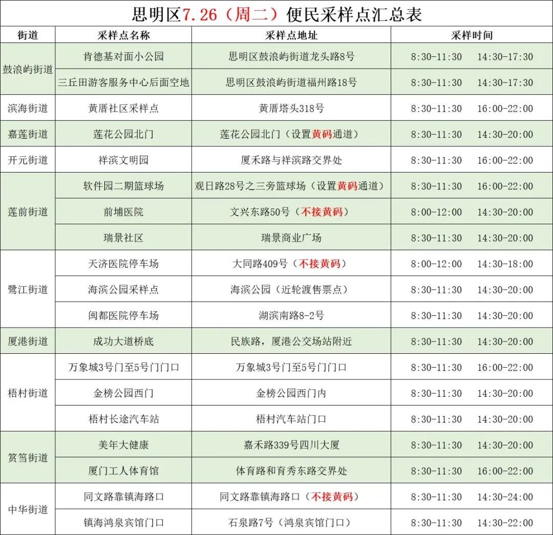 7月26日,海沧区安排26个便民核酸检测采样点,4个街道均设有黄码人员专用检测通道。海沧医院设有24小时核酸检测采样点。