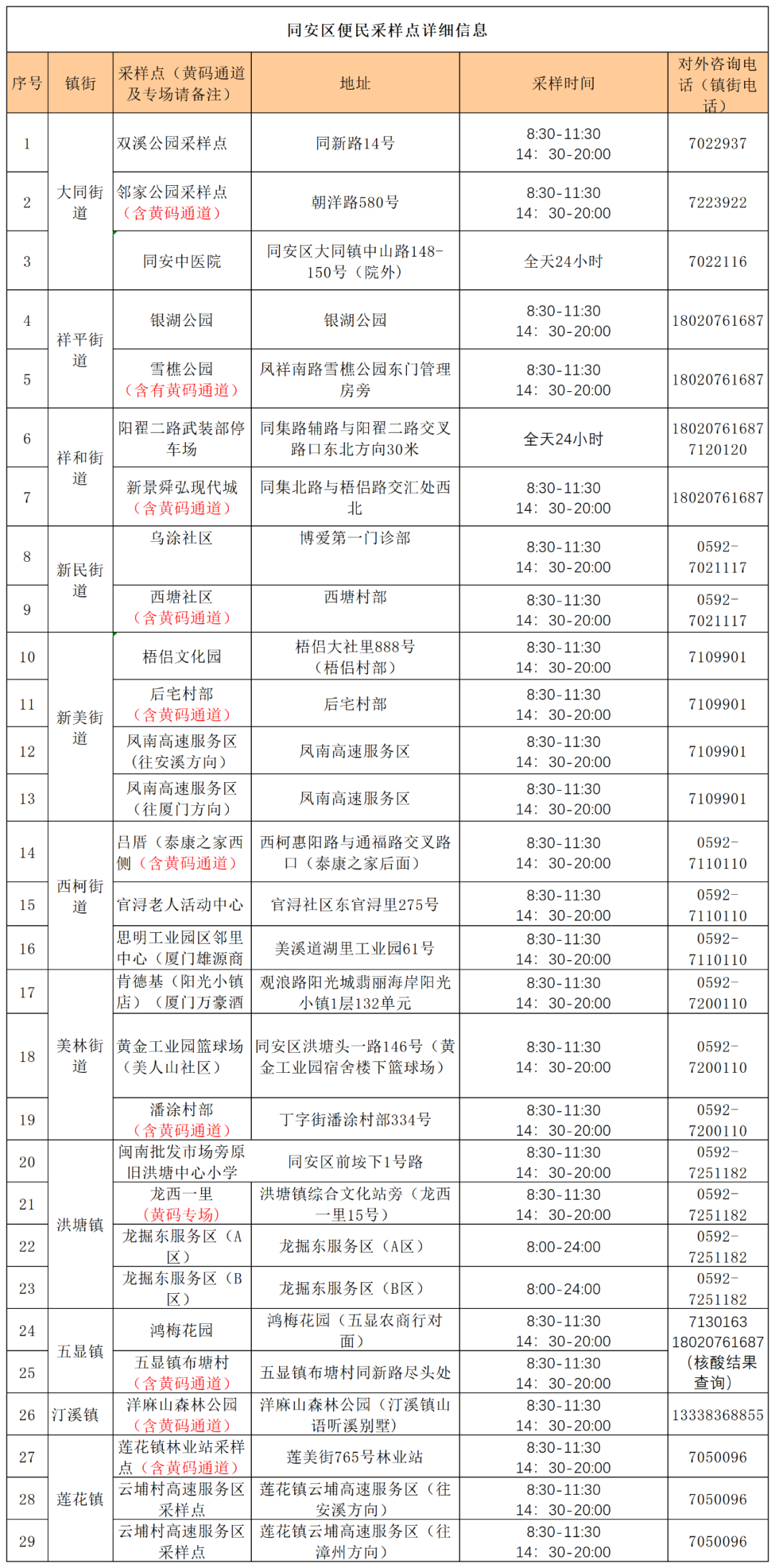 湖里区设置28个便民采样点(7个采样点设置黄码通道,4个采样点设置24小时服务),为市民群众进行核酸检测。