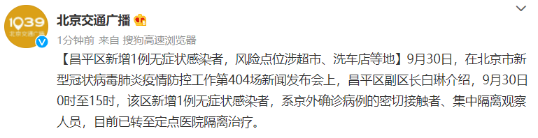 9月30日0时至15时,该区新增1例无症状感染者,系京外确诊病例的密切接触者、集中隔离观察人员,目前已转至定点医院隔离治疗。