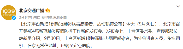9月30日,丰台区新增1例新冠肺炎病毒感染者,为外省进京人员,货车司机,在京无常住地址,已转至定点医院。