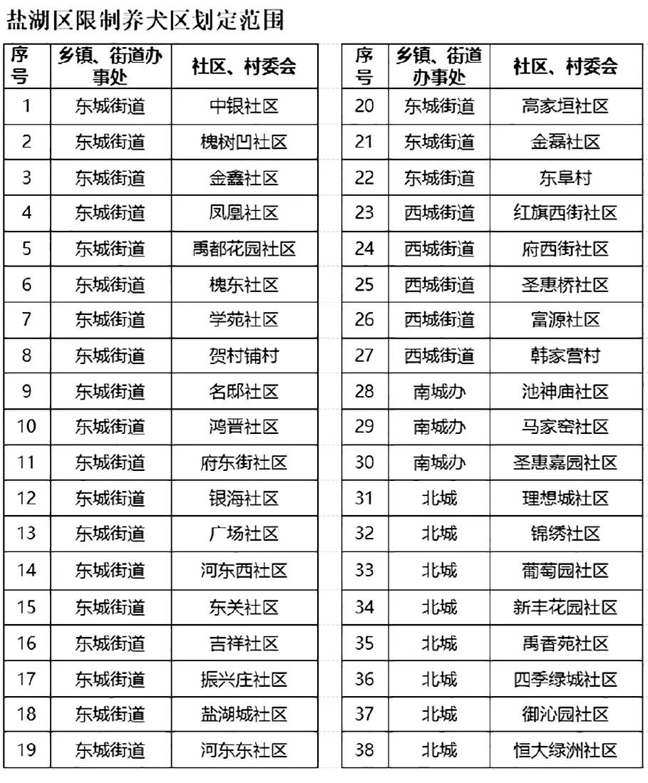为加强中心城区养犬管理,维护市容环境和公共秩序,保障公民健康和人身安全,盐湖公安分局和街道办事处以及养犬管理工作领导小组,根据《运城市养犬管理规定》(以下简称《规定》)相关要求,并结合盐湖区实际,将中心城区中银社区、槐树凹社区、金鑫社区、凤凰社区等76个社区(村)确定为限制养犬区。