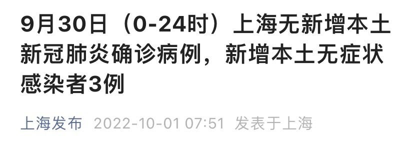 上海市卫健委10月1日通报:2022年9月30日0—24时,无新增本土新冠肺炎确诊病例,新增本土无症状感染者3例,均在隔离管控中发现,详情如下。