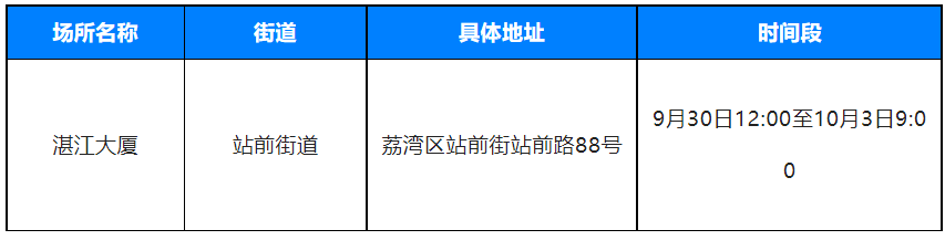 因疫情防控需要,请在相关时段到过荔湾区站前街道下述重点场所的人员,立即向所在社区联系报备,开展“三天三检”自我健康监测,期间非必要不外出、不聚集、不聚餐、不乘坐公共交通工具,同时按照社区和疾控部门的要求配合做好健康管理。重点场所名单后续将按实际情况更新。