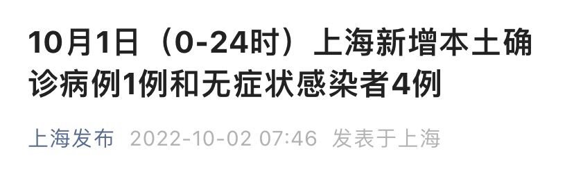上海市卫健委10月2日通报:2022年10月1日0—24时,新增本土确诊病例1例和无症状感染者4例,均在隔离管控中发现。