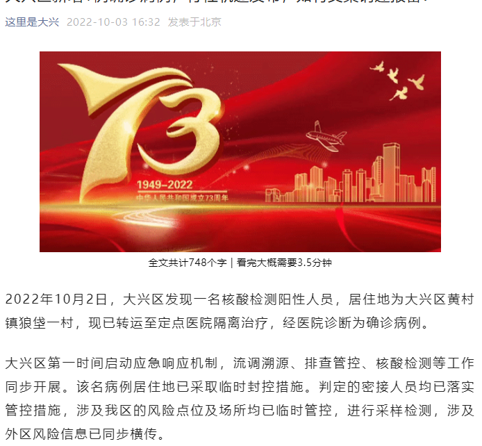 另据这里是大兴微信公众号,2022年10月2日,大兴区发现一名核酸检测阳性人员,现已转运至定点医院隔离治疗,经医院诊断为确诊病例。