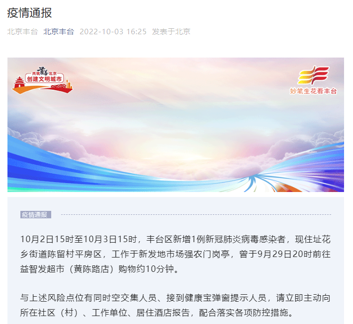 据健康丰台微信公众号,10月2日15时至10月3日15时,丰台区新增1例新冠肺炎病毒感染者。