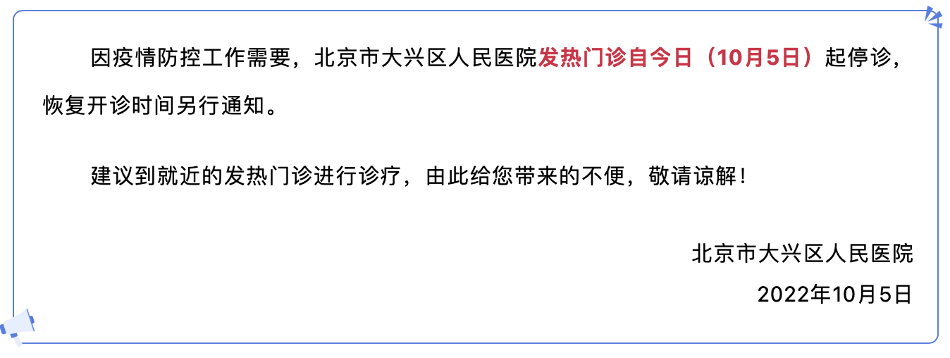 因疫情防控工作需要,北京市大兴区人民医院发热门诊自今日(10月5日)起停诊,恢复开诊时间另行通知。