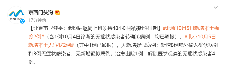 北京卫健委提醒国庆假期后返岗上班须持48小时核酸阴性证明