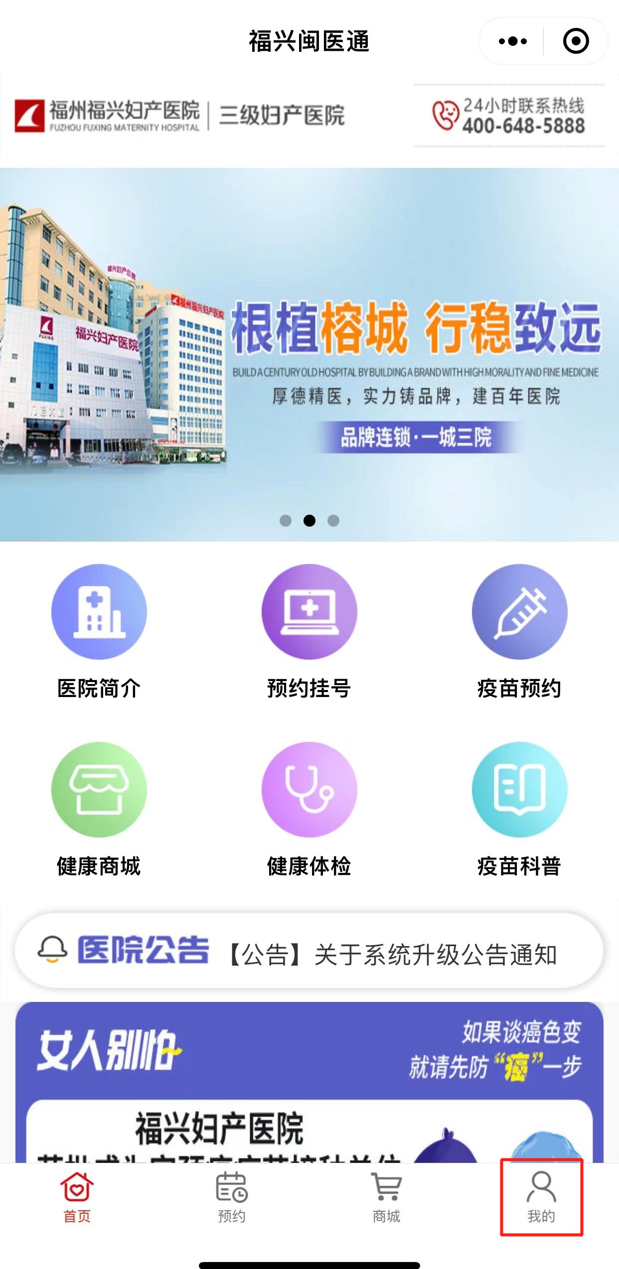 1.点击“福兴闽医通”进入小程序,点击右下角“我的”