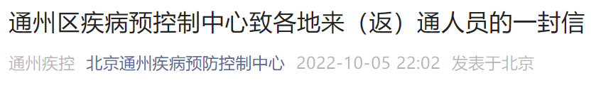 北京通州疾控中心发布返京返通防疫政策提醒(10月5日)