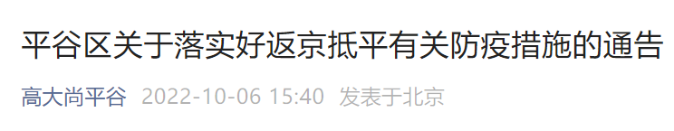 10月6日北京平谷发布落实好返京抵平有关防疫措施