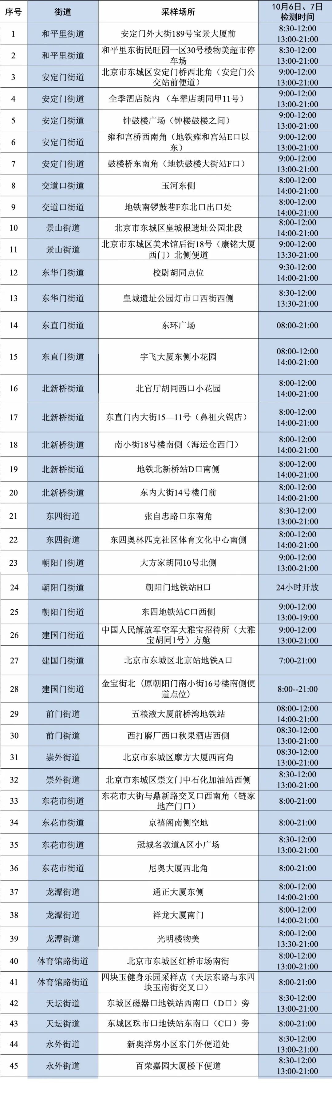 为进一步优化核酸检测服务,更好满足居民核酸检测需求,10月6日、7日,东城区临时延长采样点工作时间至21点。核酸采样点检测时间一览表↓↓↓
