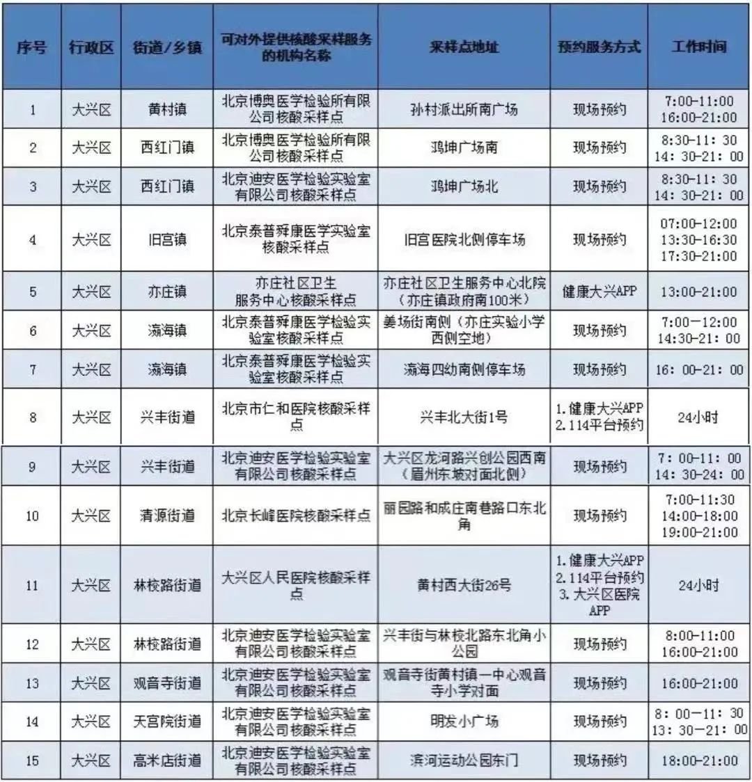 大兴区延长服务时间、坚持自然闭点。10月6日,大兴设置核酸检测点位507个(增加77个),采样通道812个(增加129个),其中大兴机场增设了4条通道,公园、景点增设4个采样点、5个通道。