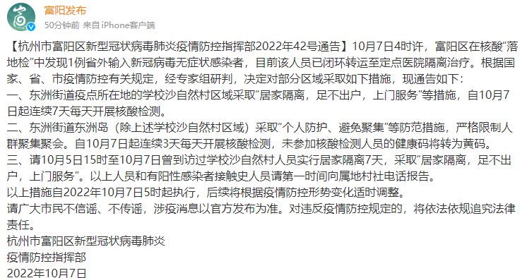 10月7日4时许,富阳区在核酸“落地检”中发现1例省外输入新冠病毒无症状感染者,目前该人员已闭环转运至定点医院隔离治疗。根据国家、省、市疫情防控有关规定,经专家组研判,决定对部分区域采取如下措施,现通告如下: