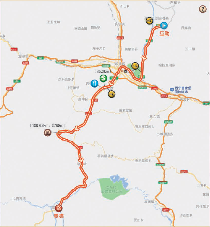 路线:互助天佑德大道—彩虹大道—花园路—西大街—东大街—迎宾大道—天佑德大道(绕2圈)—彩虹大道—花园路—西大街—东大街—迎宾大道—宁互高速—韵家口—G6—宁贵高速—S101(上新庄—拉脊山口—加洛—千户—尕让—阿什贡)—贵德县黄河清大桥—河关大道