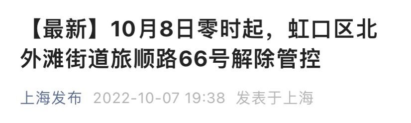 上海市新冠肺炎疫情防控工作领导小组办公室发布消息:根据《新型冠状病毒肺炎防控方案(第九版)》要求,经研究决定,自2022年10月8日零时起,将虹口区北外滩街道旅顺路66号解除管控。