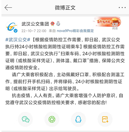2、武汉公交:执行“扫乘车码、24小时核酸检测阴性证明(或核酸采样凭证)、测体温、戴口罩”措施,保障公共交通疫情防控安全。请广大乘客积极配合,主动佩戴好口罩,积极配合测温工作,提前打开手机扫码,并将绿码、24小时核酸检测阴性证明(或核酸采样凭证)出示给驾驶员。