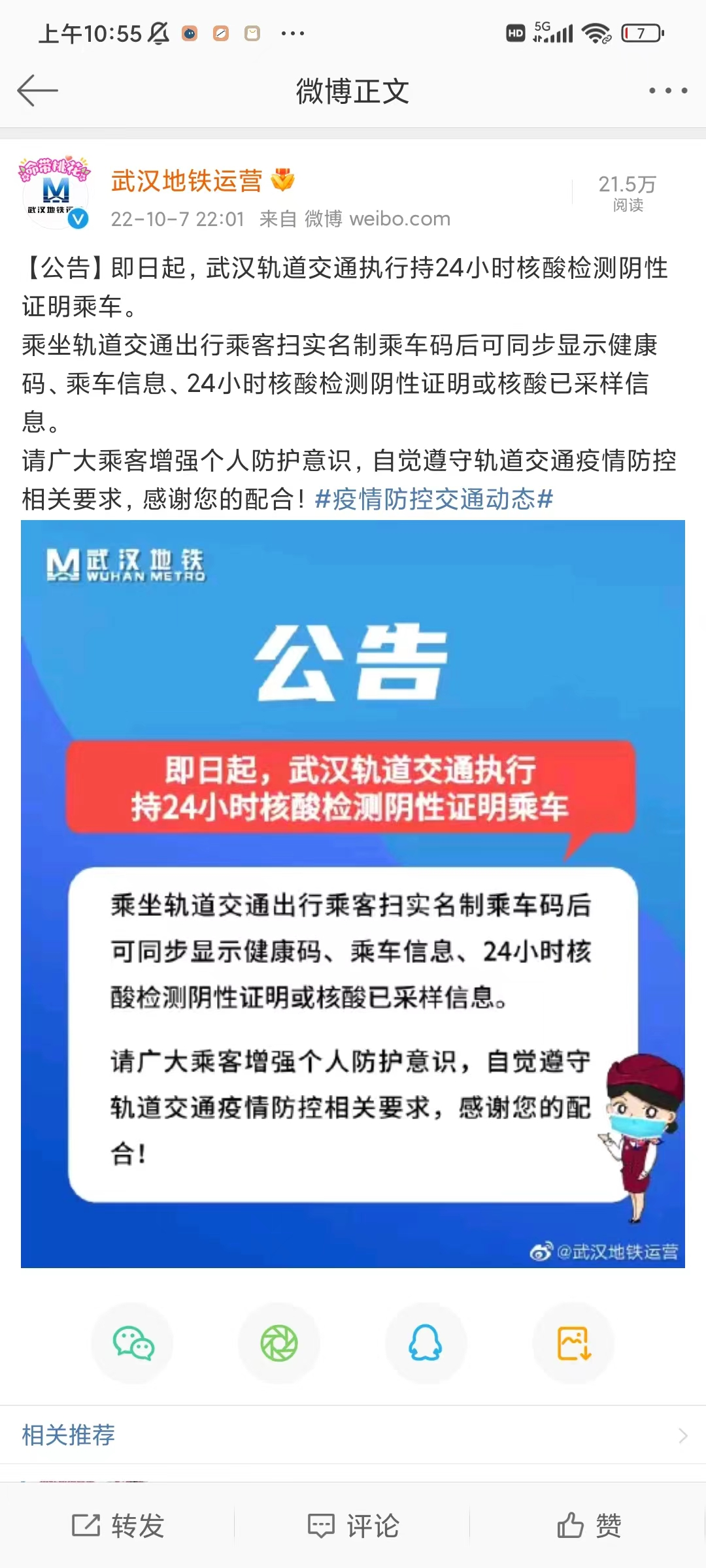 1、武汉地铁:武汉轨道交通执行持24小时核酸检测阴性证明乘车。乘坐轨道交通出行乘客扫实名制乘车码后可同步显示健康码、乘车信息、24小时核酸检测阴性证明或核酸已采样信息。