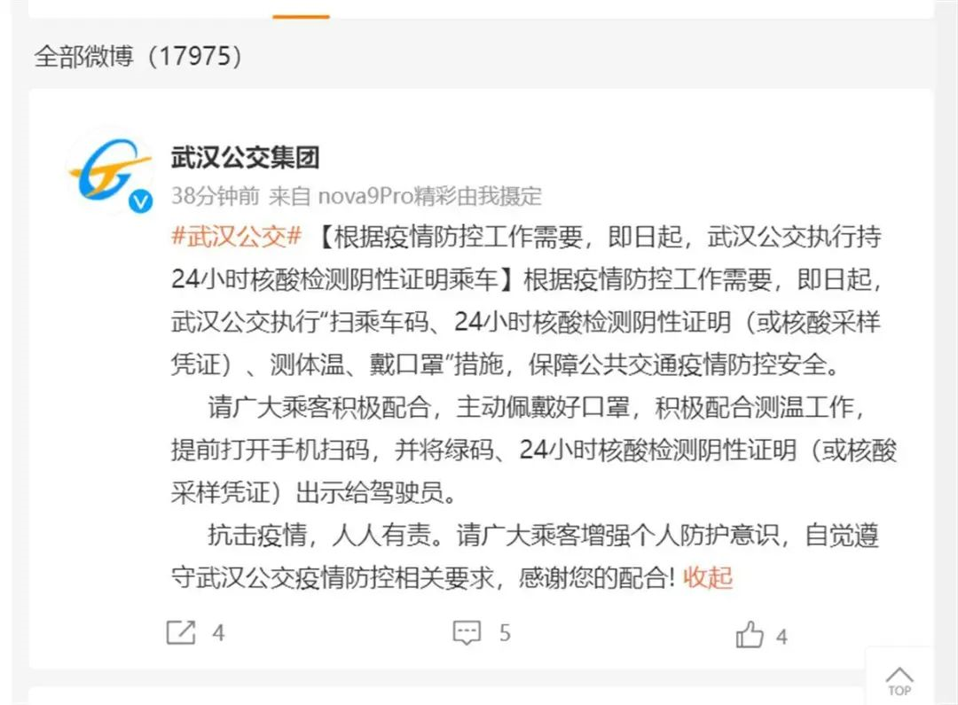 根据疫情防控工作需要,即日(10月7日)起,武汉公交执行“扫乘车码、24小时核酸检测阴性证明(或核酸采样凭证)、测体温、戴口罩”措施,保障公共交通疫情防控安全。