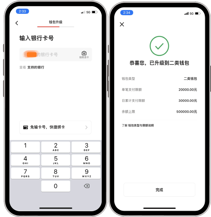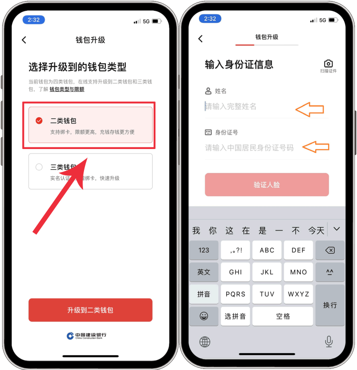 ⑥输入银行卡号,完成钱包升级(不一定要是建行卡,还支持绑定其他行银行卡)
