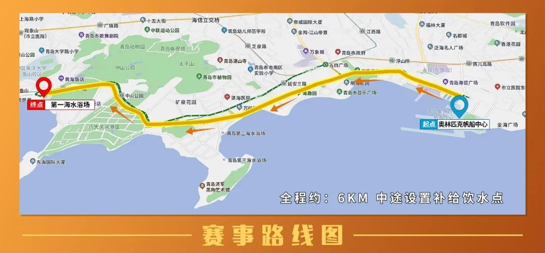 比赛路线:奥帆中心海上宴会厅外广场(起点)→天地间雕塑(中途补寄)→第一海水浴场(终点)